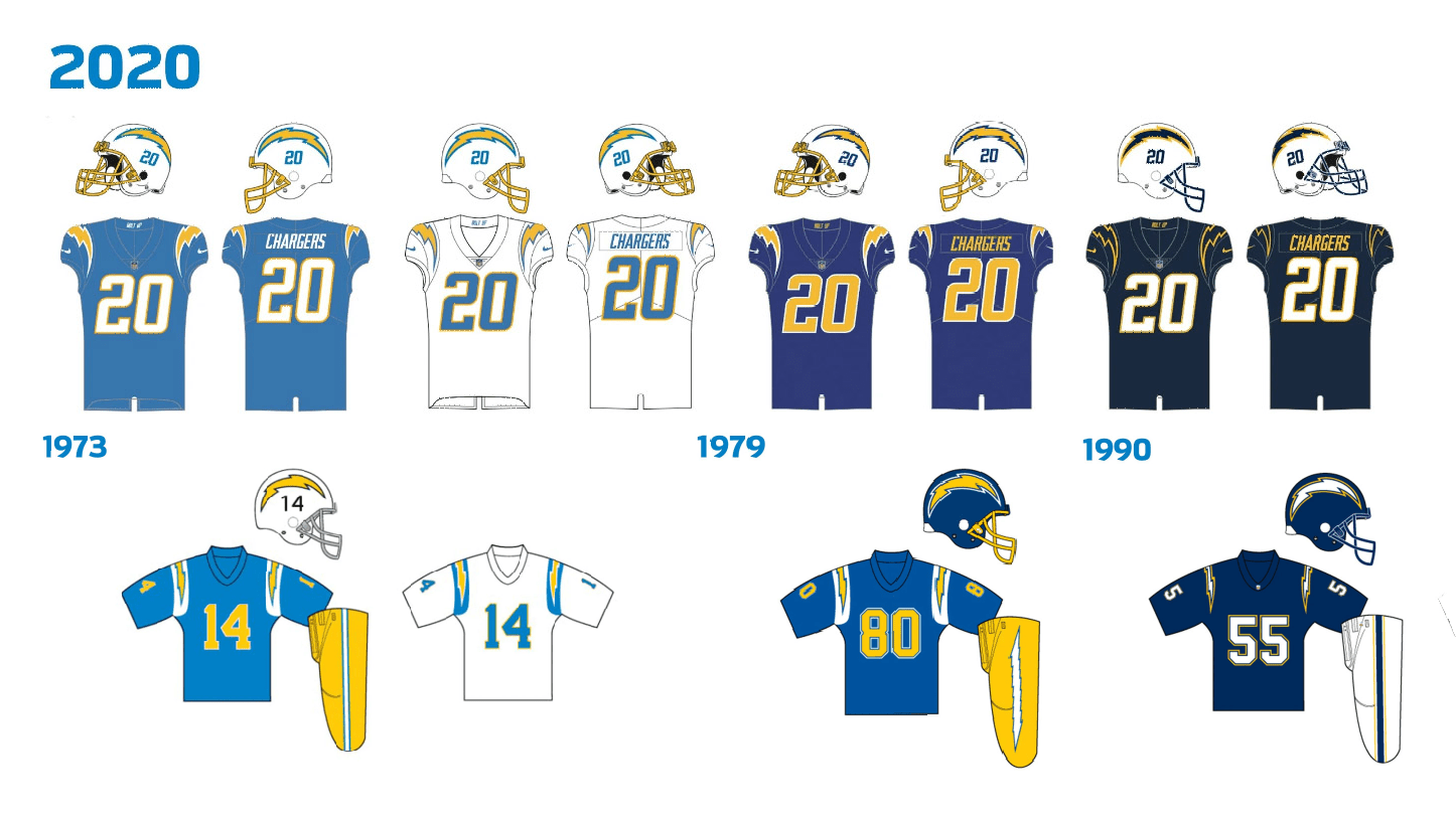Los angeles charger unveiled the new team uniforms in april 2020.. Quintessentially southern california, the chargers are relaunching what is very much an aspirational brand. Full lineup of chargers new uniforms. A visual break down of the chargers uniform throughout the years. The la chargers revealed the uniforms for the 2020 season and it is safe to say that. Find a new los angeles chargers jerseys at the official online retailer of the nfl.. Evolution of the chargers uniform.